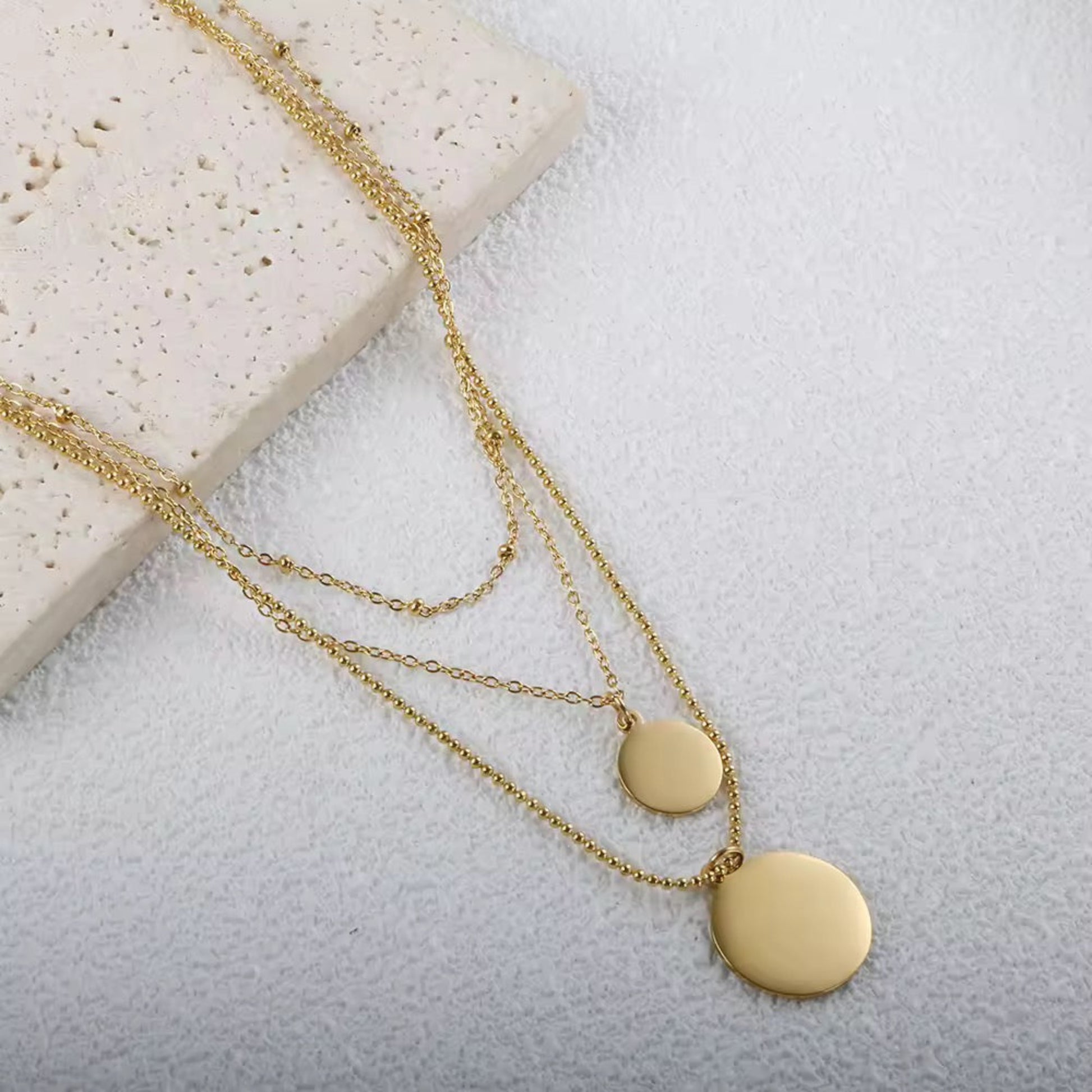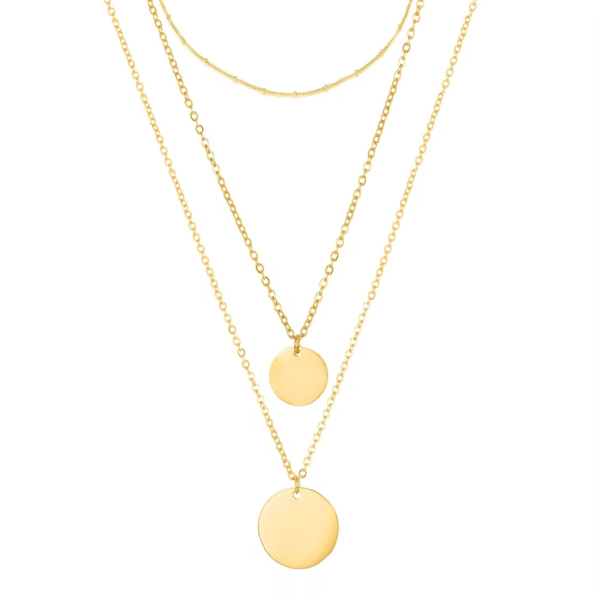zwei Ketten mit runden Coin-Anhängern in unterschiedlicher Größe sowie einer schlichten, feinen Kette ohne Anhänger. Zusammen entsteht ein stilvoller Layered Look, der jedes Outfit aufwertet.